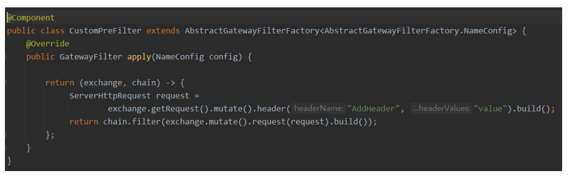 아래 코드는 request에 특정한 헤더값을 넣어주는 PreFilter입니다.